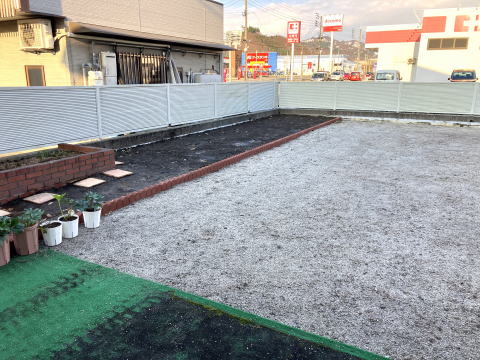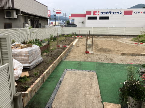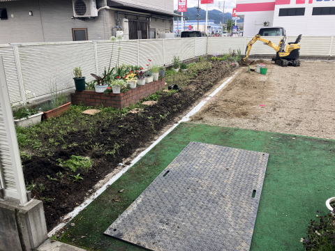 既存の縁石ブロックをアンティーク調レンガ縁石に変更するため撤去しています