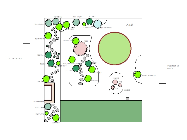 図面には全体レイアウトと樹木、レンガの縁石や飛び石までを記載してます。